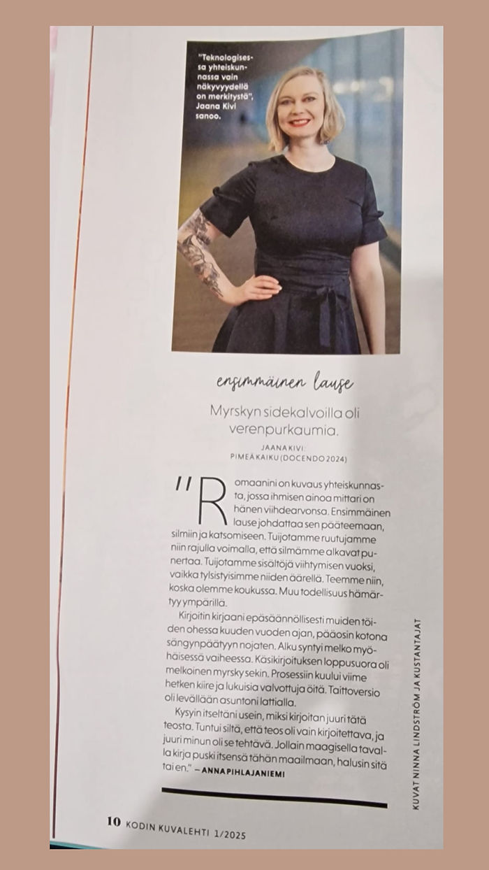 Annoin haastattelun (9.12.2024) Kodin Kuvalehden kulttuuripalstalle ensimmäinen lause -nimiseen osiooon. Koska lopullinen juttu oli melko lyhyt, avaan tässä blogitekstissä vuoropuheluna vastaukseni kaikkiin toimittajan esittämiin kysymyksiin. Vastaukset avaavat hyvällä tavalla ajatuksiani Pimeä kaiku -teoksen takaa.